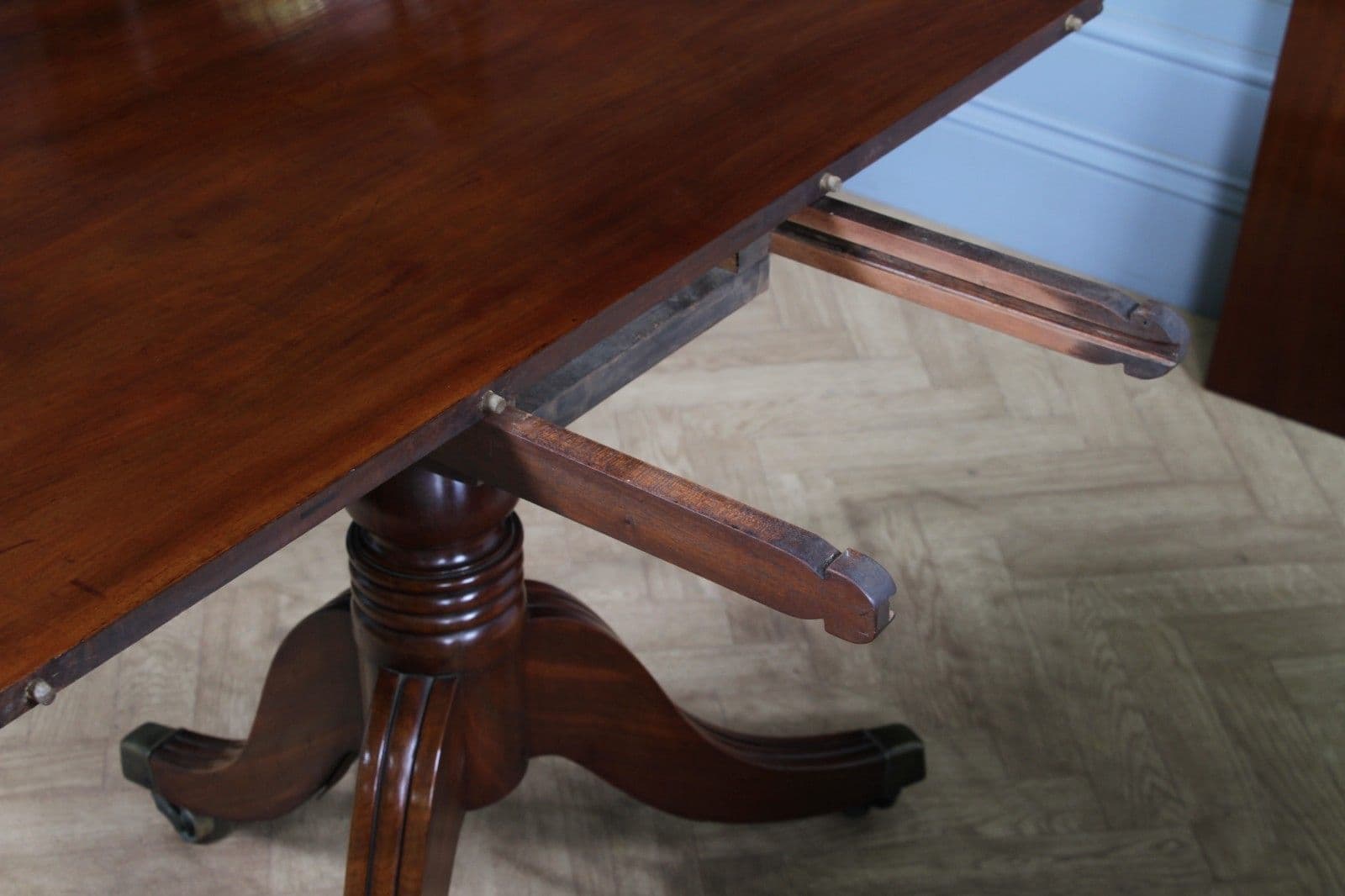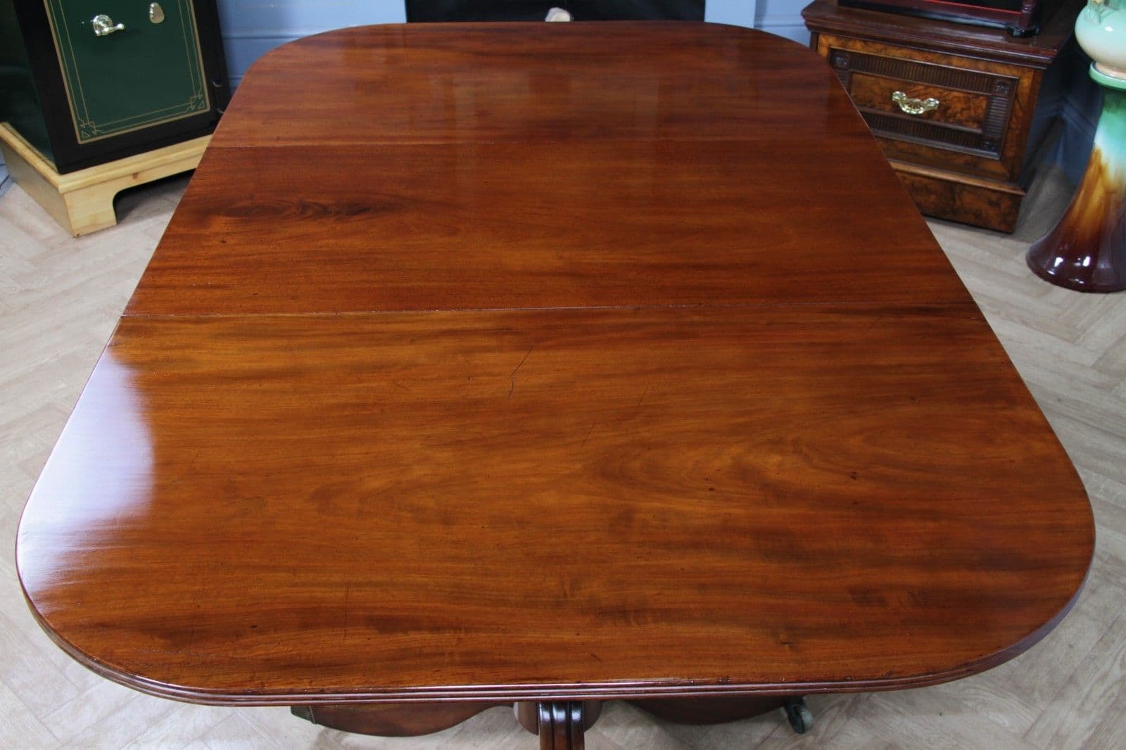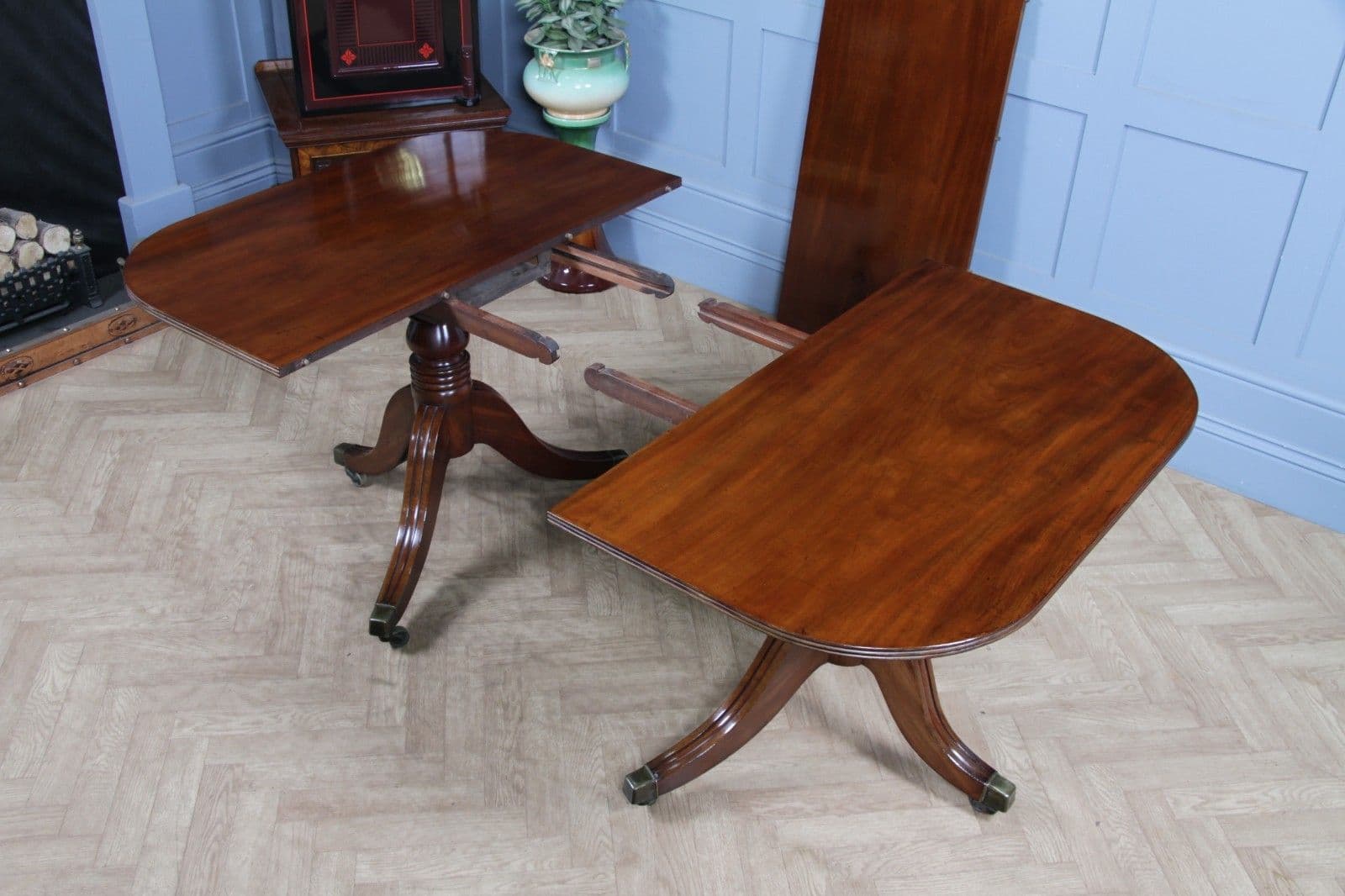 The table has been sympathetically restored in our workshop to ensure it is immediately ready for its new home, marrying its genuine antique character with modern usability. Although the table may have originally been much longer with a third centre pedestal, the remaining sections form a perfectly proportioned and beautiful dining suite. Notably, the pull-out centre leaf supports, which hold the central leaf in place, appear to have been remade at some point. This restoration work has been executed extremely well, resulting in a mechanism that is likely more robust and durable than the original, ensuring the table looks fantastic and is fully functional when fully assembled. This piece offers exceptional quality and stability, making it a very usable and imposing center-piece for any dining room.