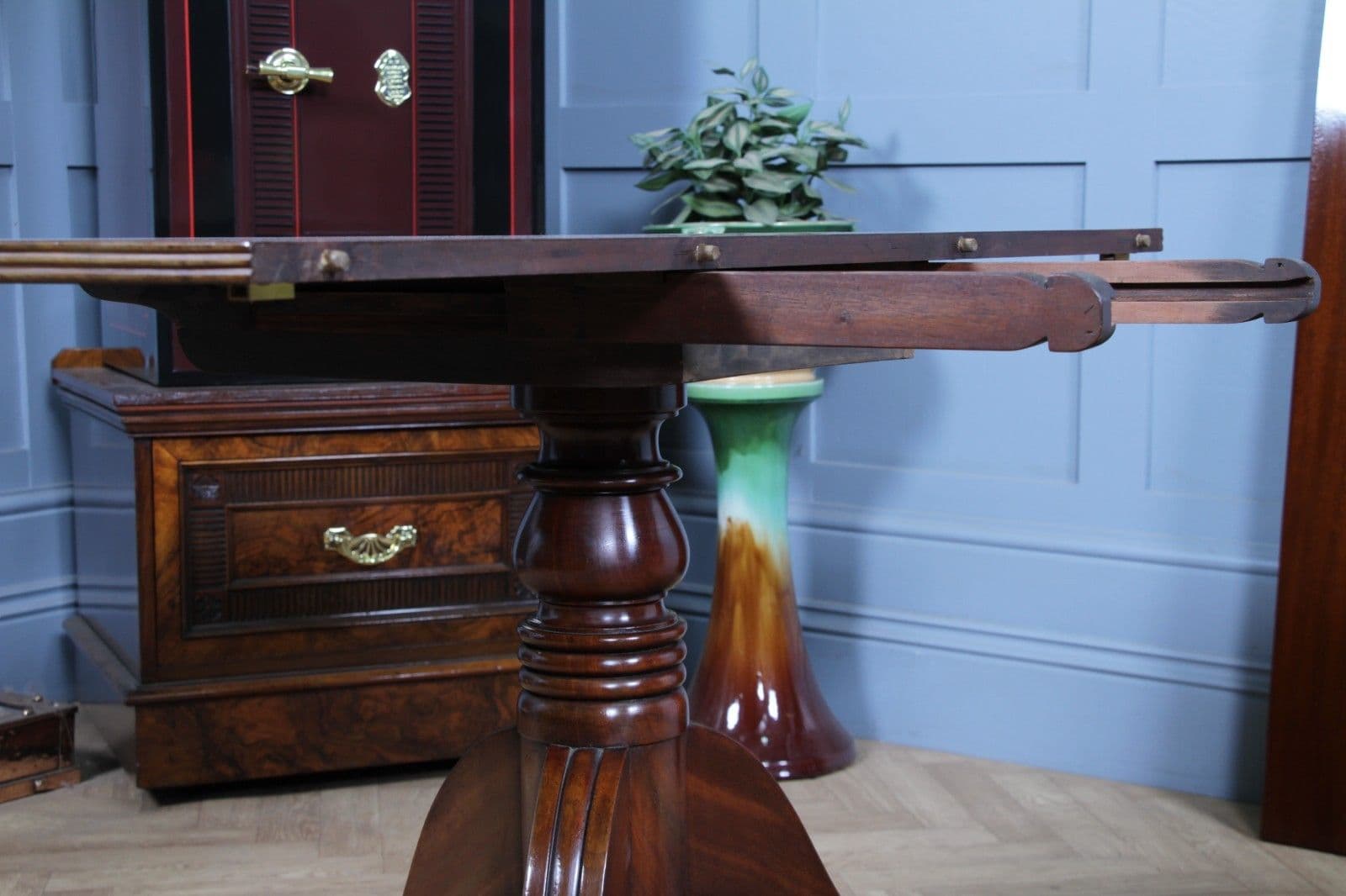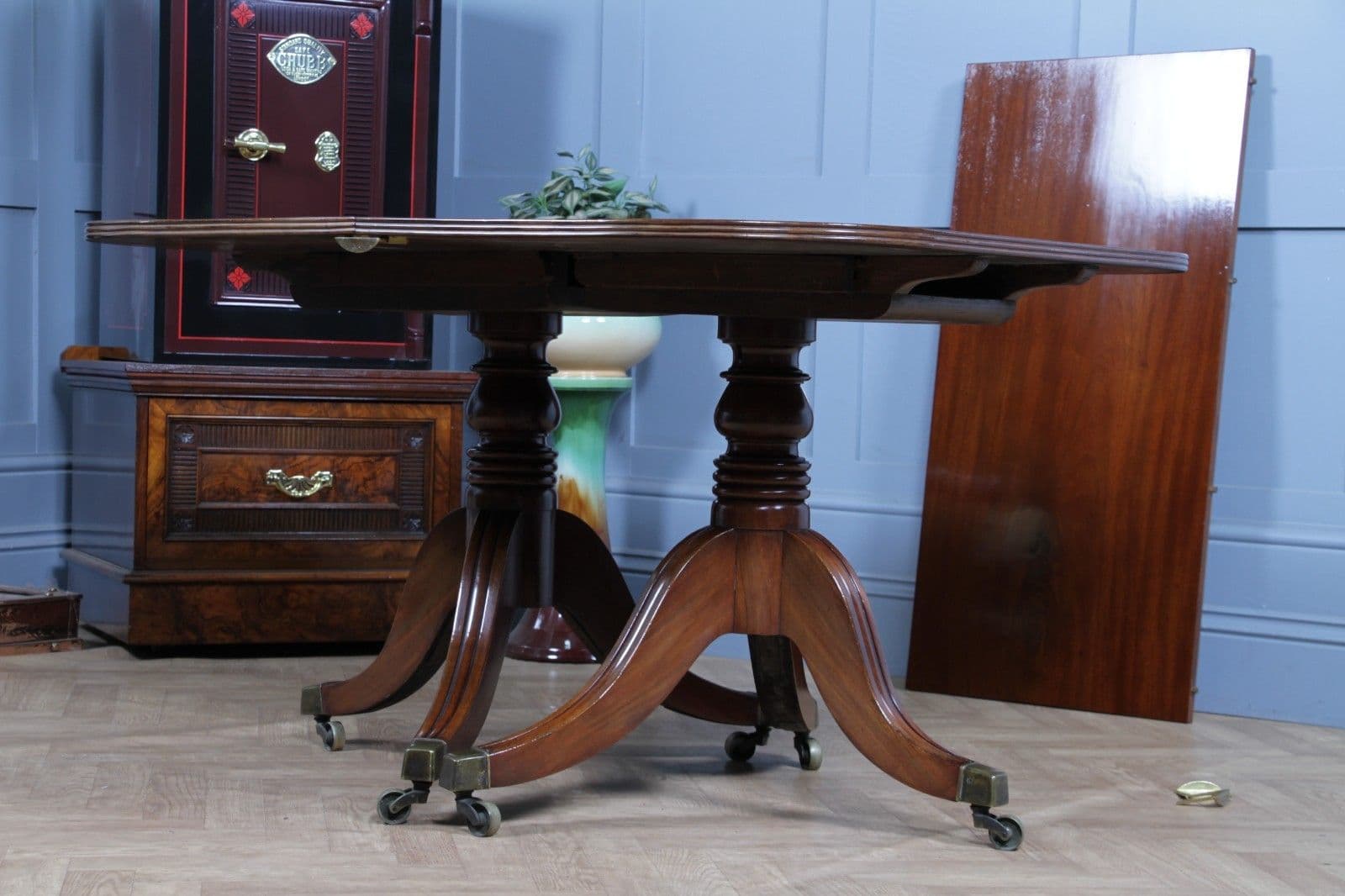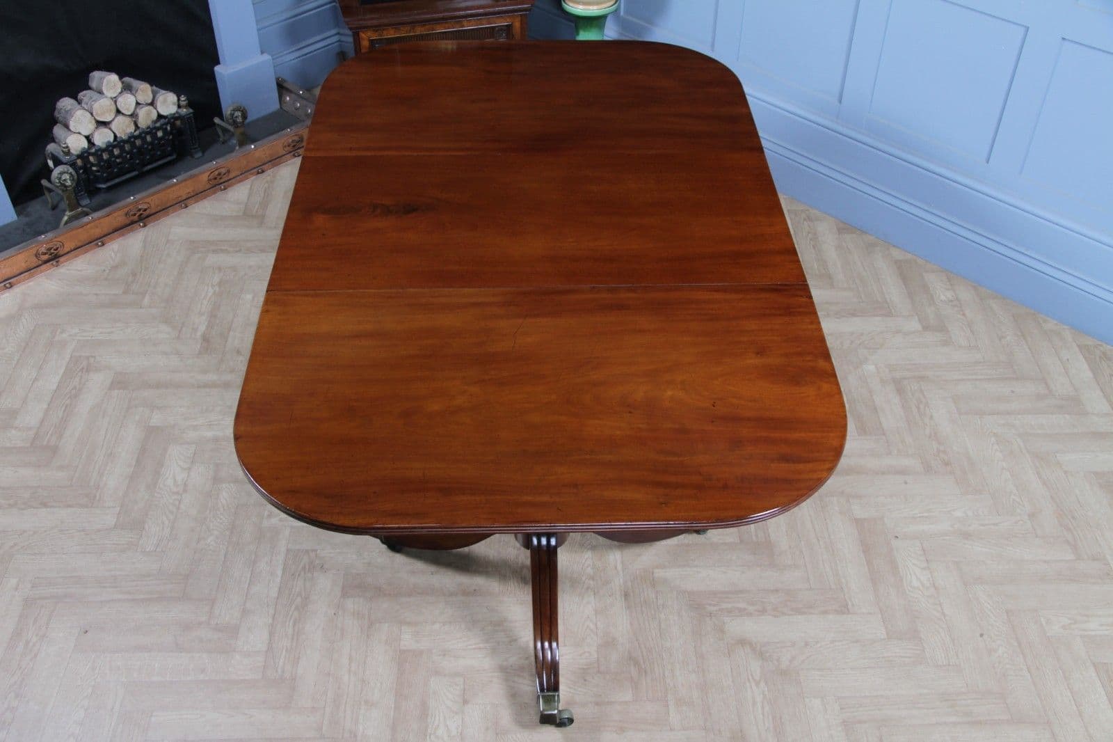 The table has been sympathetically restored in our workshop to ensure it is immediately ready for its new home, marrying its genuine antique character with modern usability. Although the table may have originally been much longer with a third centre pedestal, the remaining sections form a perfectly proportioned and beautiful dining suite. Notably, the pull-out centre leaf supports, which hold the central leaf in place, appear to have been remade at some point. This restoration work has been executed extremely well, resulting in a mechanism that is likely more robust and durable than the original, ensuring the table looks fantastic and is fully functional when fully assembled. This piece offers exceptional quality and stability, making it a very usable and imposing center-piece for any dining room.