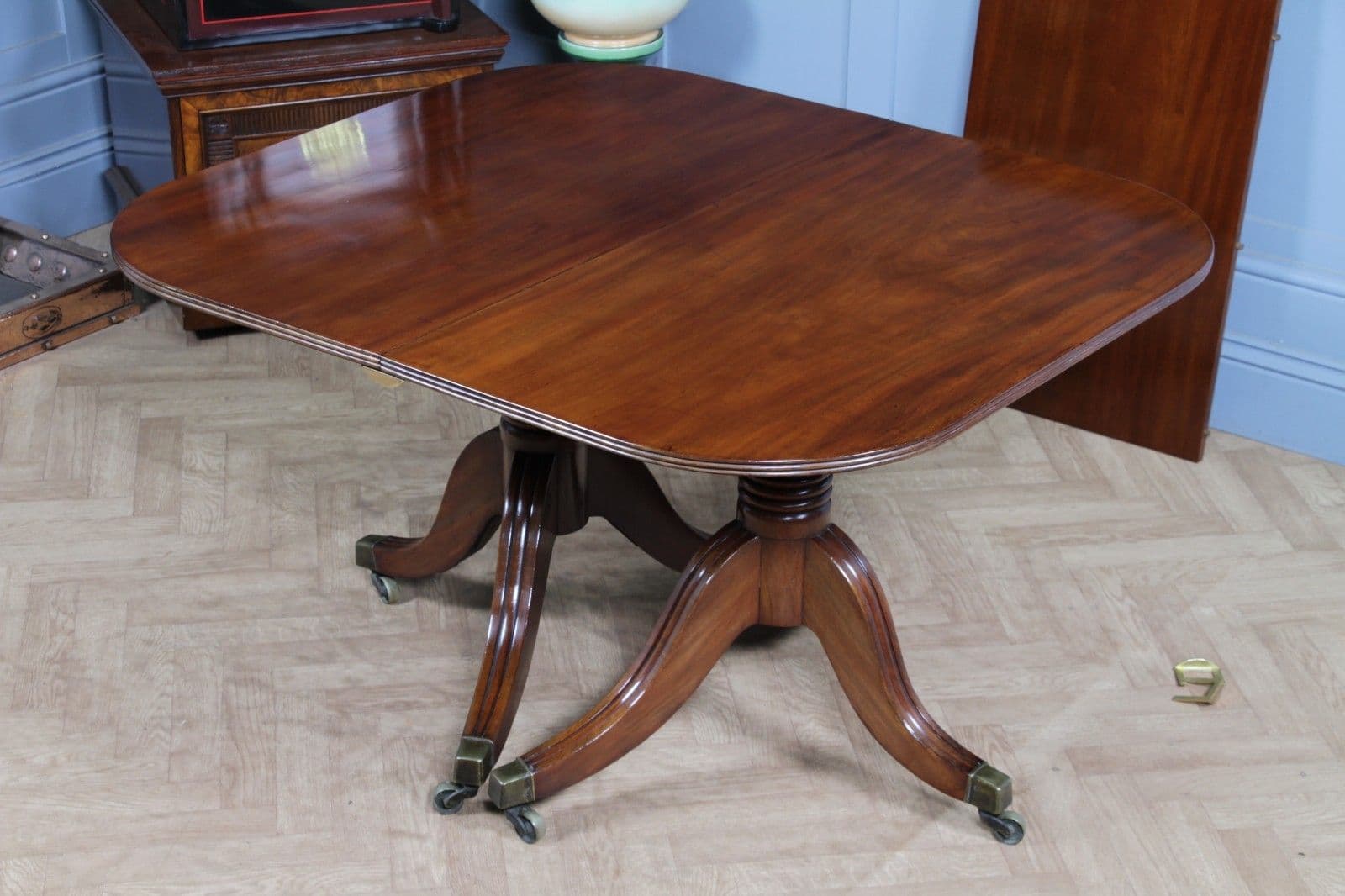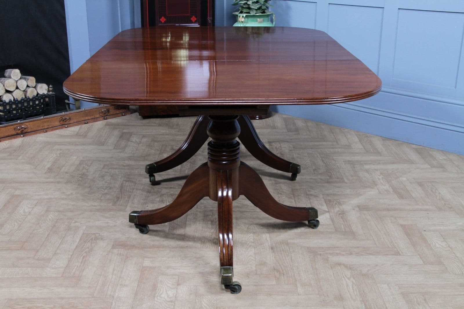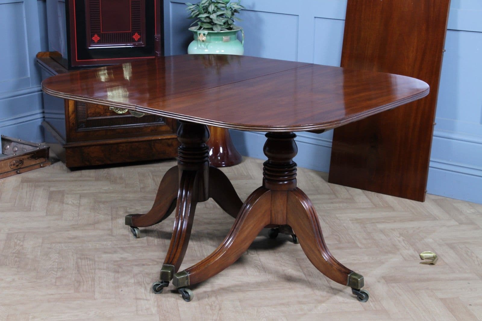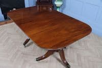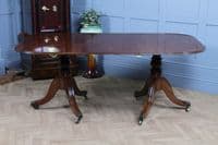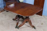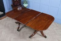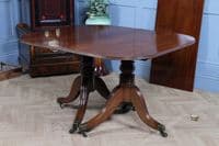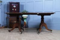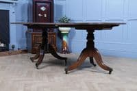 This is a magnificent and genuinely antique Georgian/Regency (C1820) twin pedestal dining table, crafted from richly toned mahogany that displays a beautiful, lightly faded original colour and a superb grain. The oblong top features gently rounded corners and is protected by a lovely glazed French polished 'skin' that emphasizes the timber's natural figuring. The table is supported by two substantial, finely turned pedestals, each resting on three gracefully swept, reeded splayed legs finished with brass box castors. The construction of this piece is unusually solid, heavy, and robust for its type, suggesting a piece of very high quality. This table is highly versatile: it can function as a generous extending dining table using a central loose leaf, or the two 'D-end' sections can be separated to serve as a high-quality pair of side pedestal tables. The table will comfortably sit up to 8 people with the centre leaf installed and up to 6 people with just the pedestals together.