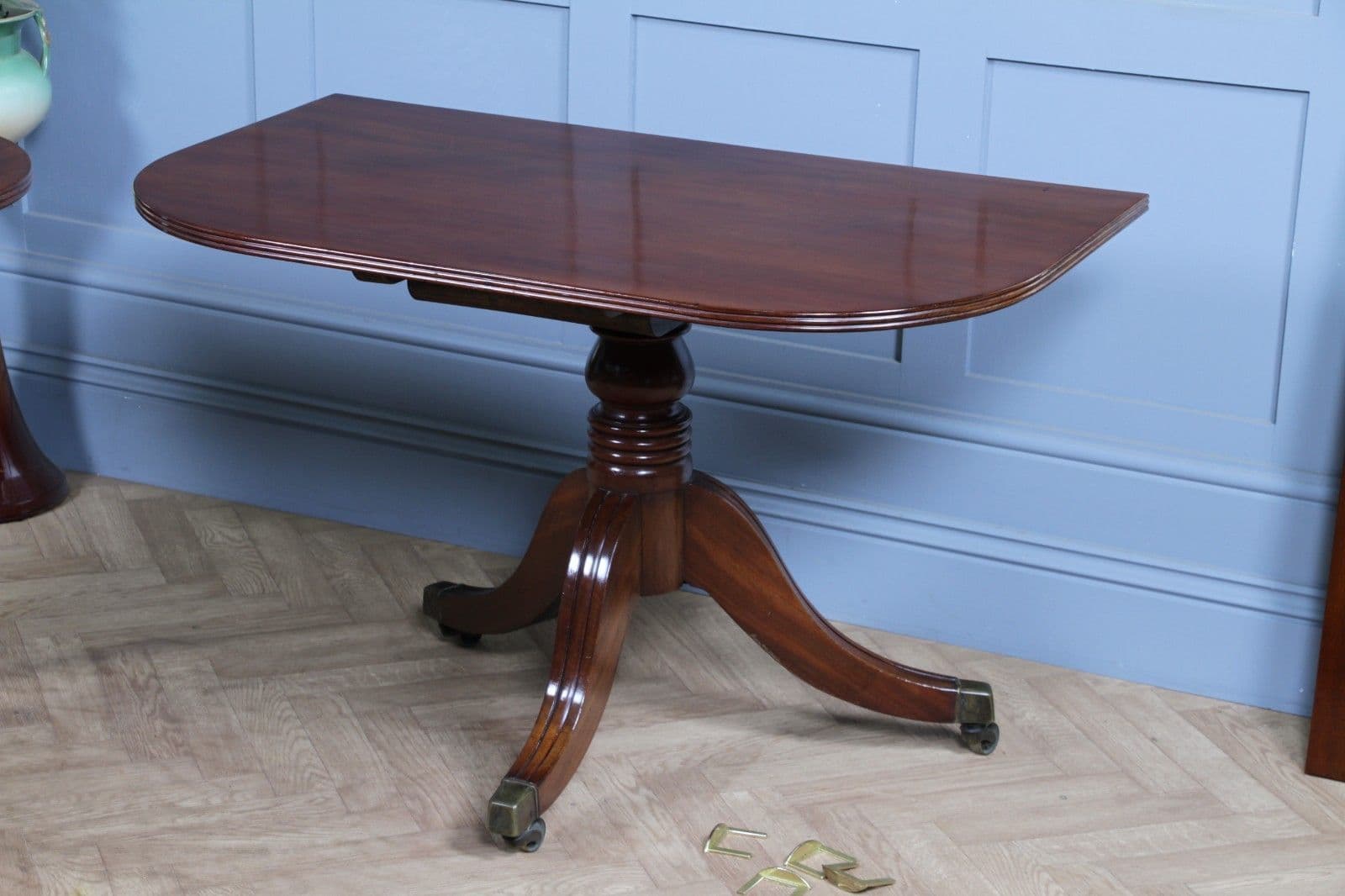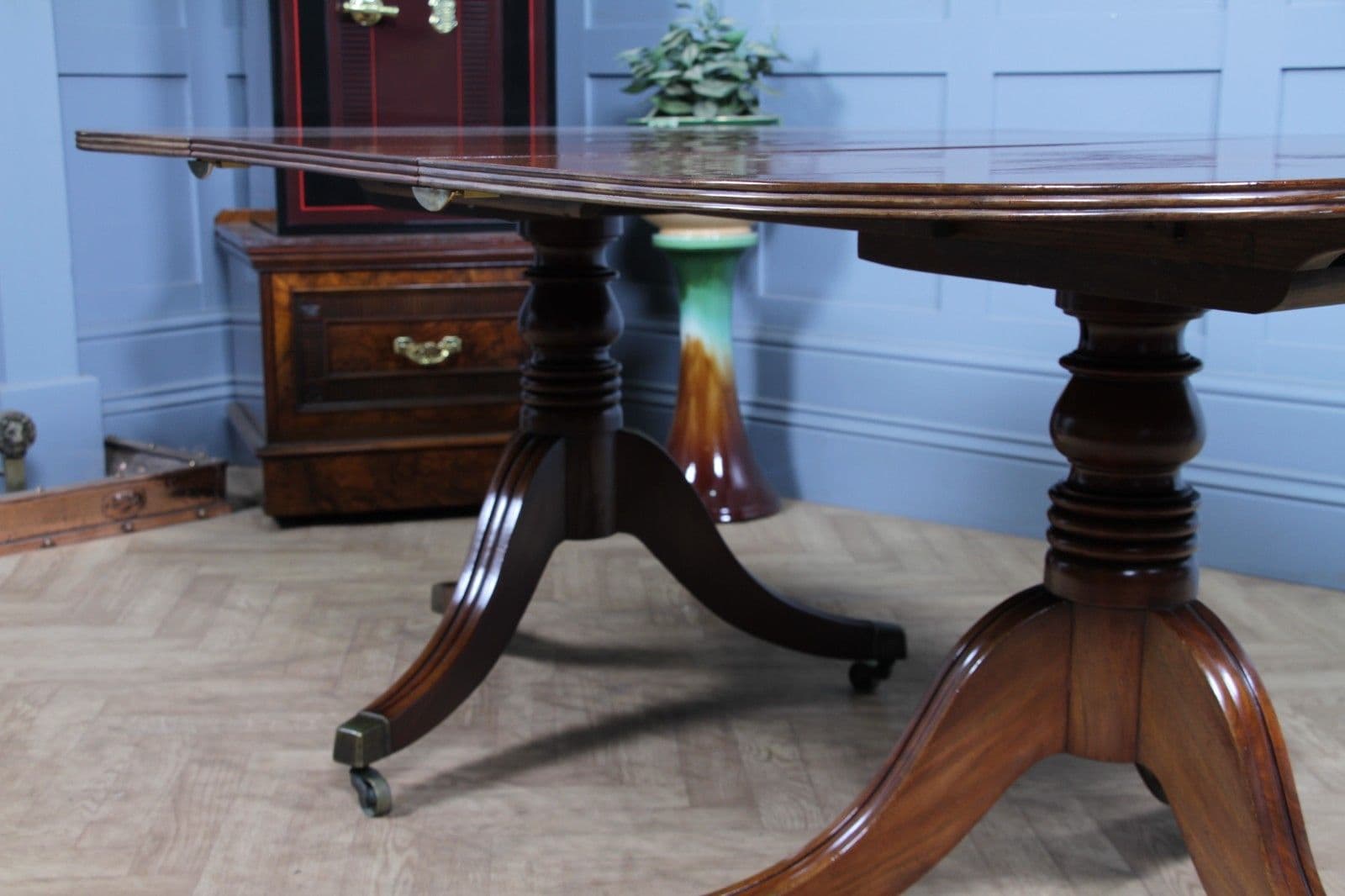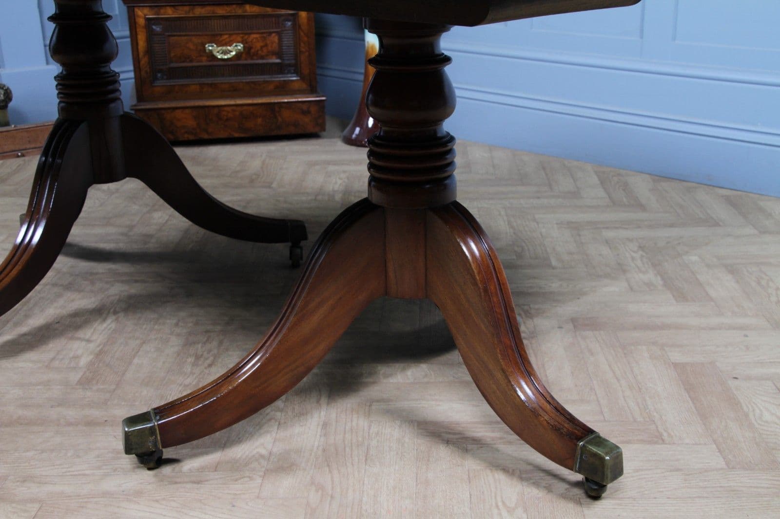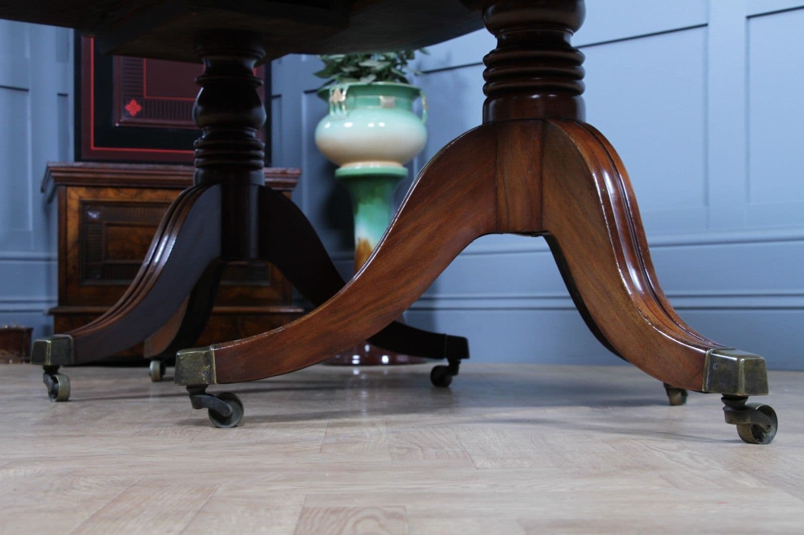 This is a magnificent and genuinely antique Georgian/Regency (C1820) twin pedestal dining table, crafted from richly toned mahogany that displays a beautiful, lightly faded original colour and a superb grain. The oblong top features gently rounded corners and is protected by a lovely glazed French polished 'skin' that emphasizes the timber's natural figuring. The table is supported by two substantial, finely turned pedestals, each resting on three gracefully swept, reeded splayed legs finished with brass box castors. The construction of this piece is unusually solid, heavy, and robust for its type, suggesting a piece of very high quality. This table is highly versatile: it can function as a generous extending dining table using a central loose leaf, or the two 'D-end' sections can be separated to serve as a high-quality pair of side pedestal tables. The table will comfortably sit up to 8 people with the centre leaf installed and up to 6 people with just the pedestals together.