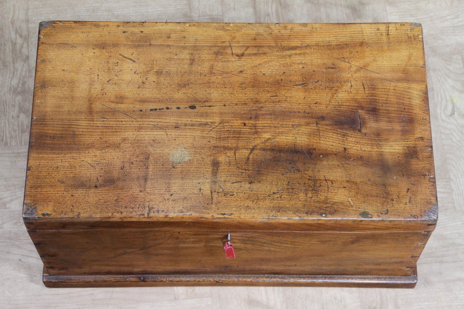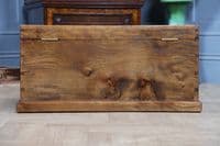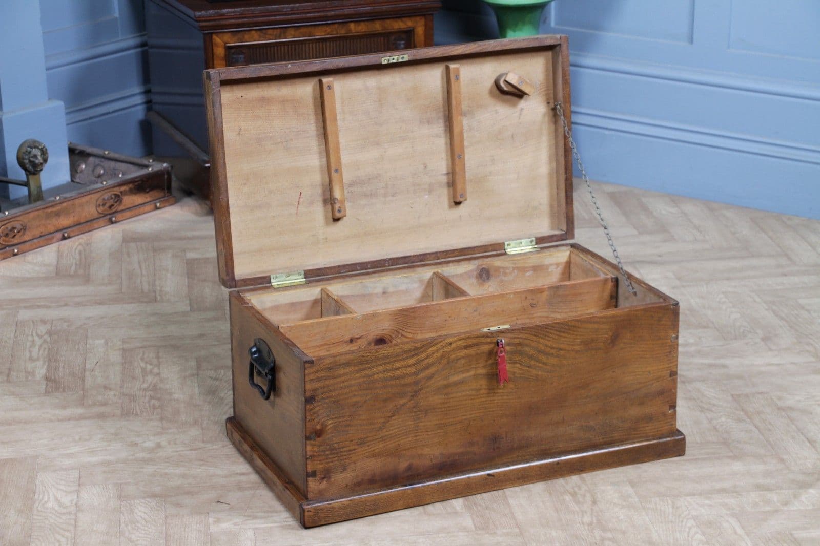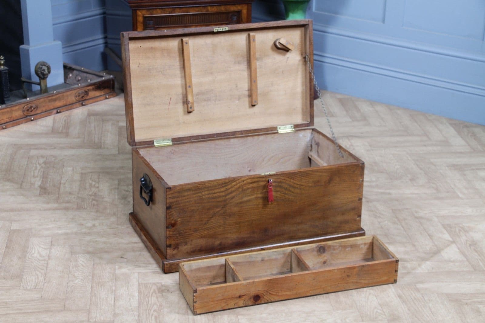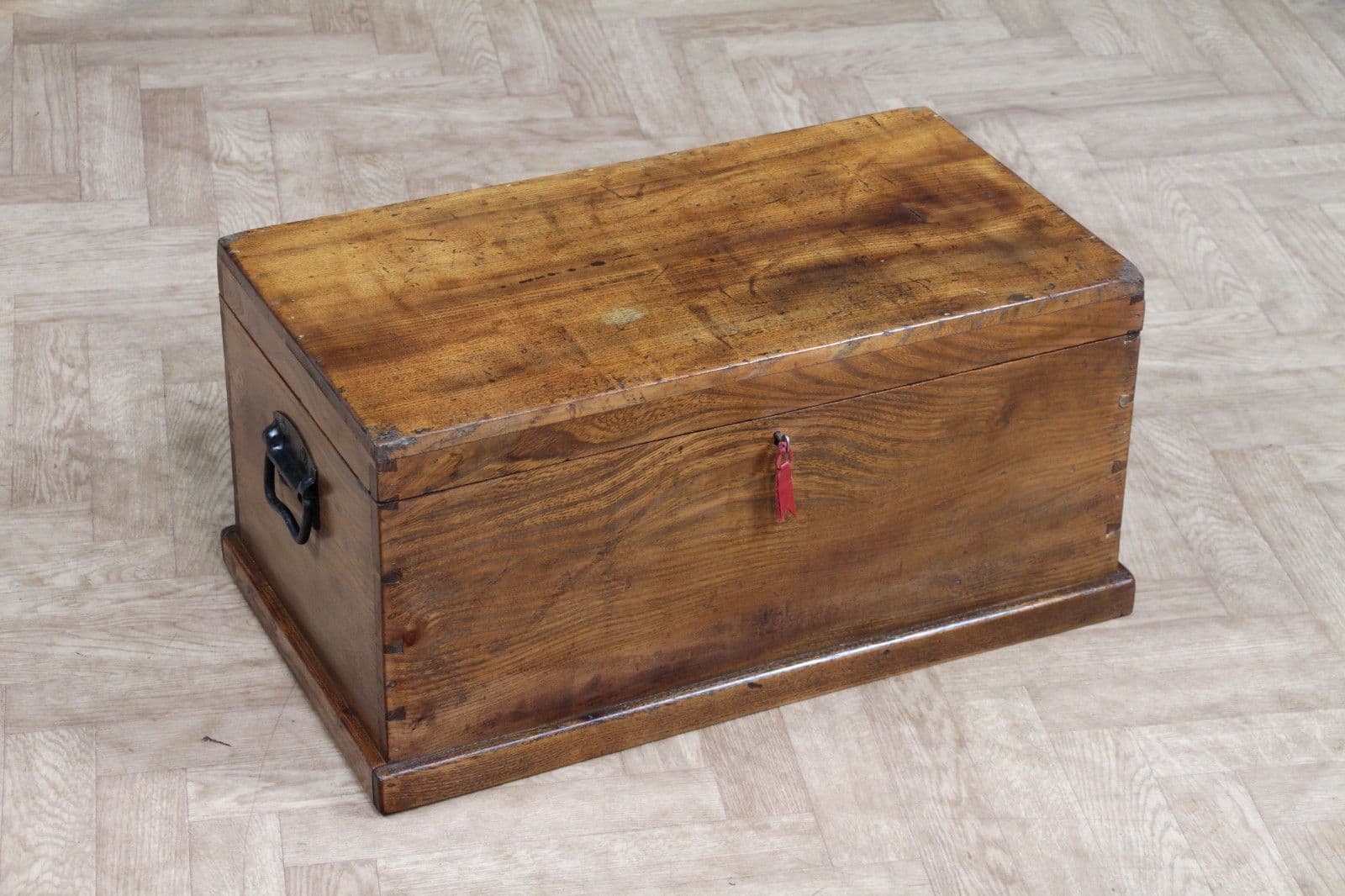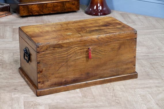 This is an exceptional and heavy-duty Antique Cabinet Maker's or Joiner's Toolbox, dating from the late Victorian or early Edwardian period, circa 1900. This highly desirable chest embodies a piece of social and craft history, as it was likely constructed by the tradesman himself—a common and proud practice that served as a showcase for their own high level of woodworking skill. The chest is primarily constructed from solid, wide planks of richly figured Elm wood, a durable and handsome timber rarely seen used so extensively, even forming the wide-board base. The quality of construction is evident in the finely executed hand-cut dovetail joints at all four corners, which provide exceptional structural integrity. Visually, the elm boasts a striking, warm honey-brown hue that has developed a magnificent deep, aged patina over a century of use, with the authentic surface marks of a working piece only enhancing its character. The original finish has been gently cleaned and waxed to beautifully highlight the natural grain and colour. Functionally, the chest is fully equipped with its original hardware. It features robust wrought iron carrying handles mounted on plates on either end, designed to support the weight of a full set of tools. Security is provided by the original brass lever box lock, which is fully functional and accompanied by its key, charmingly tied with a small red genuine leather ribbon. The hinged lid stays securely open thanks to a solid brass chain mechanism. Internally, the chest maintains its original utilitarian structure, including a removable, compartmentalised wooden tool tray and the original simple wooden mounting blocks on the underside of the lid, intended for securing a hand tenon saw. Beyond its historical value, this piece offers versatile functionality in a modern home, serving as a unique and conversation-starting coffee table, a rustic storage ottoman, or a small blanket chest for anyone who appreciates quality craftsmanship and vintage woodworking history.