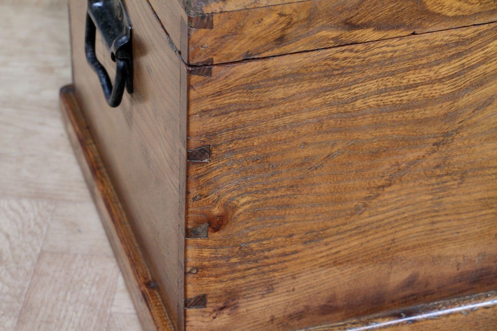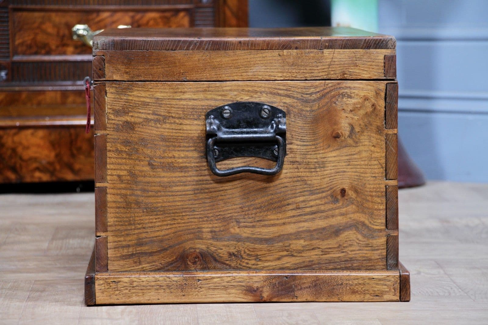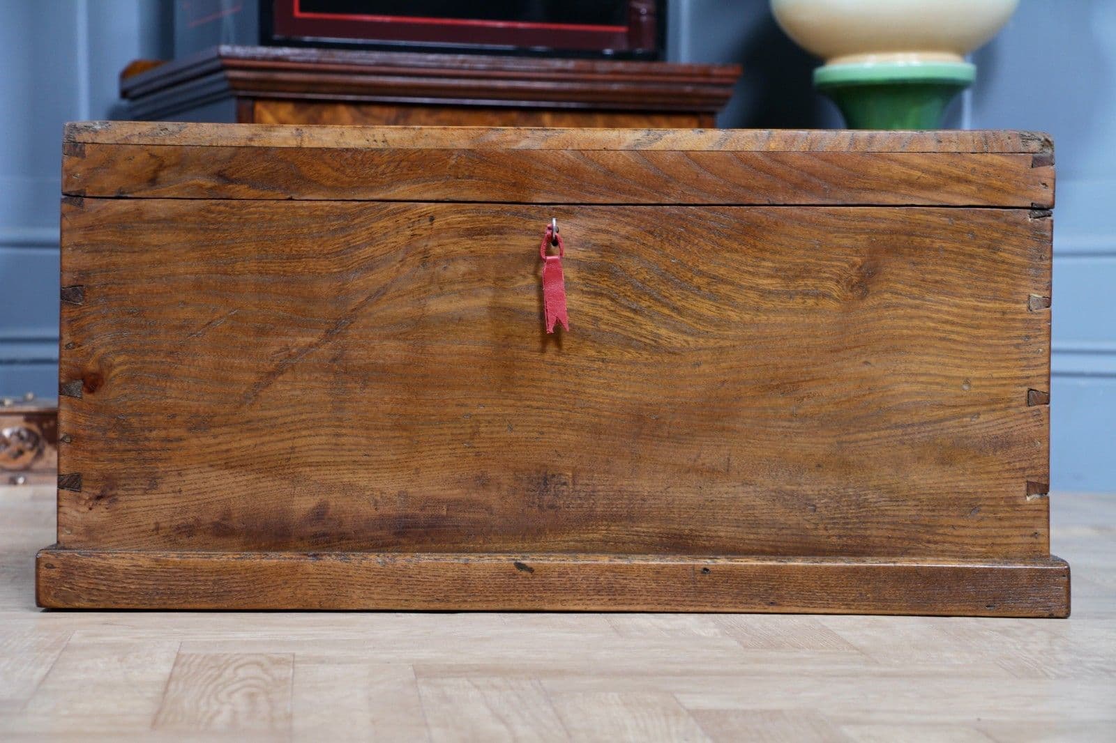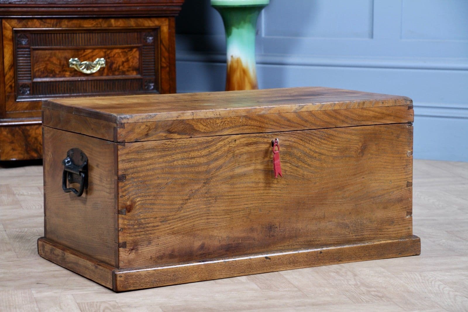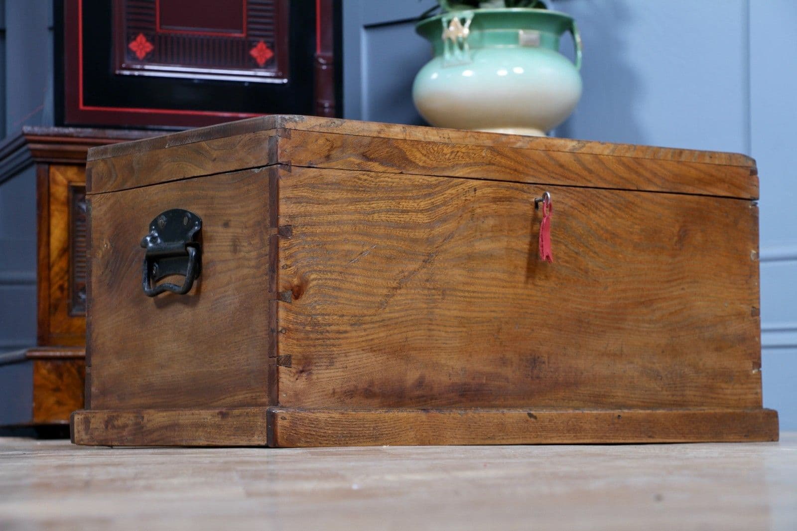 This is an exceptional and heavy-duty Antique Cabinet Maker's or Joiner's Toolbox, dating from the late Victorian or early Edwardian period, circa 1900. This highly desirable chest embodies a piece of social and craft history, as it was likely constructed by the tradesman himself—a common and proud practice that served as a showcase for their own high level of woodworking skill. The chest is primarily constructed from solid, wide planks of richly figured Elm wood, a durable and handsome timber rarely seen used so extensively, even forming the wide-board base. The quality of construction is evident in the finely executed hand-cut dovetail joints at all four corners, which provide exceptional structural integrity. Visually, the elm boasts a striking, warm honey-brown hue that has developed a magnificent deep, aged patina over a century of use, with the authentic surface marks of a working piece only enhancing its character. The original finish has been gently cleaned and waxed to beautifully highlight the natural grain and colour. Functionally, the chest is fully equipped with its original hardware. It features robust wrought iron carrying handles mounted on plates on either end, designed to support the weight of a full set of tools. Security is provided by the original brass lever box lock, which is fully functional and accompanied by its key, charmingly tied with a small red genuine leather ribbon. The hinged lid stays securely open thanks to a solid brass chain mechanism. Internally, the chest maintains its original utilitarian structure, including a removable, compartmentalised wooden tool tray and the original simple wooden mounting blocks on the underside of the lid, intended for securing a hand tenon saw. Beyond its historical value, this piece offers versatile functionality in a modern home, serving as a unique and conversation-starting coffee table, a rustic storage ottoman, or a small blanket chest for anyone who appreciates quality craftsmanship and vintage woodworking history.