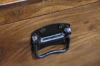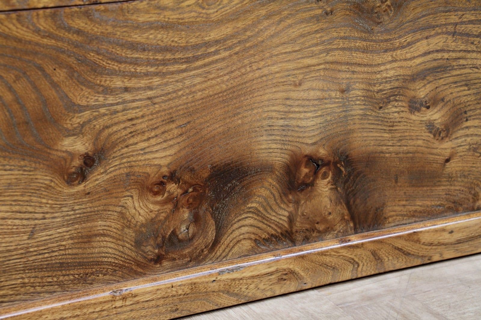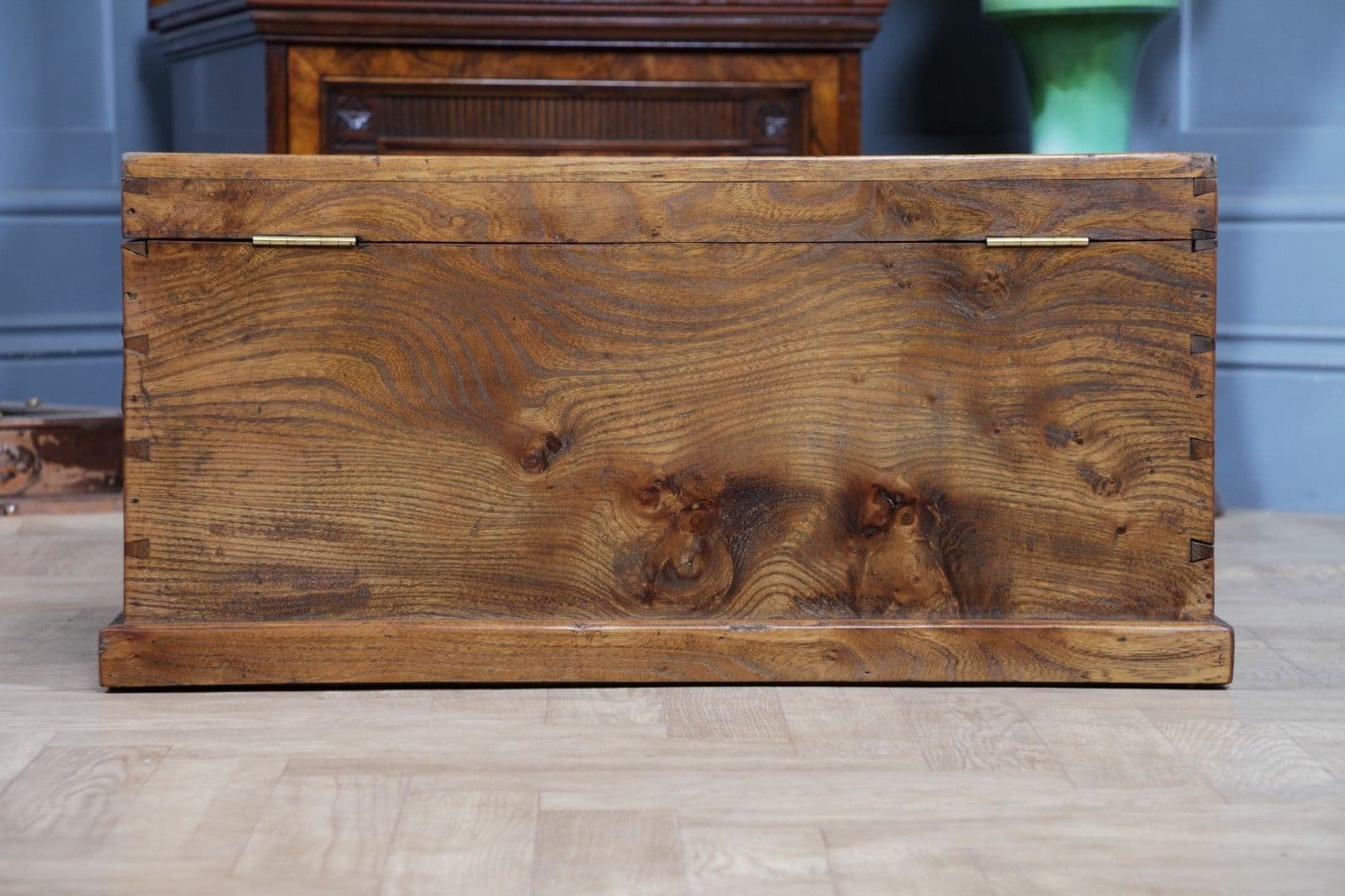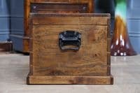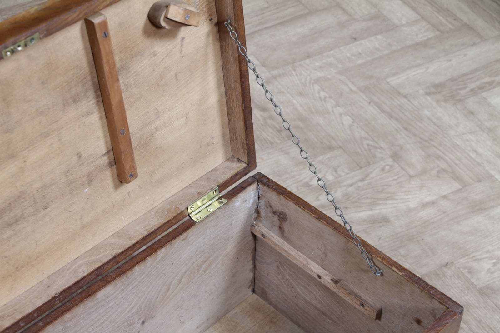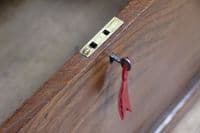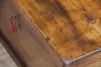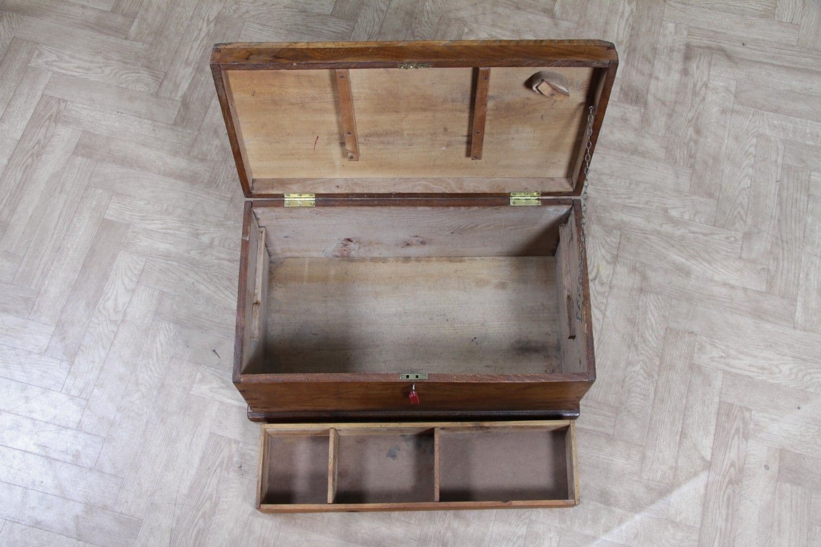 This is an exceptional and heavy-duty Antique Cabinet Maker's or Joiner's Toolbox, dating from the late Victorian or early Edwardian period, circa 1900. This highly desirable chest embodies a piece of social and craft history, as it was likely constructed by the tradesman himself—a common and proud practice that served as a showcase for their own high level of woodworking skill. The chest is primarily constructed from solid, wide planks of richly figured Elm wood, a durable and handsome timber rarely seen used so extensively, even forming the wide-board base. The quality of construction is evident in the finely executed hand-cut dovetail joints at all four corners, which provide exceptional structural integrity. Visually, the elm boasts a striking, warm honey-brown hue that has developed a magnificent deep, aged patina over a century of use, with the authentic surface marks of a working piece only enhancing its character. The original finish has been gently cleaned and waxed to beautifully highlight the natural grain and colour. Functionally, the chest is fully equipped with its original hardware. It features robust wrought iron carrying handles mounted on plates on either end, designed to support the weight of a full set of tools. Security is provided by the original brass lever box lock, which is fully functional and accompanied by its key, charmingly tied with a small red genuine leather ribbon. The hinged lid stays securely open thanks to a solid brass chain mechanism. Internally, the chest maintains its original utilitarian structure, including a removable, compartmentalised wooden tool tray and the original simple wooden mounting blocks on the underside of the lid, intended for securing a hand tenon saw. Beyond its historical value, this piece offers versatile functionality in a modern home, serving as a unique and conversation-starting coffee table, a rustic storage ottoman, or a small blanket chest for anyone who appreciates quality craftsmanship and vintage woodworking history.