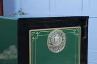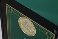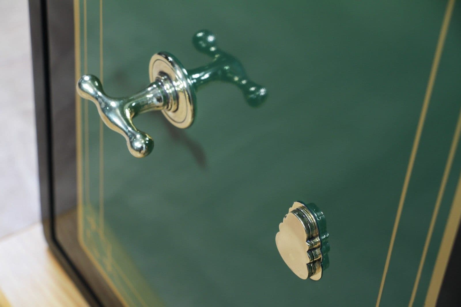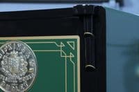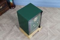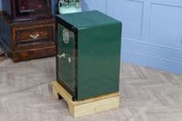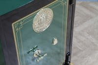This bespoke luxury safe has been fully restored from bare metal, having been stripped and linished to ensure the highest quality refurbishment possible. The safe is predominantly painted in a beautiful, high-gloss Dark Green featuring a Black frame, which perfectly complements the gold leaf effect pinstripes and coach lines that skilfully embellish the door and hinges. The safe has then been carefully polished and waxed to protect the paintwork and give a beautiful high-gloss sheen, with all brasswork meticulously polished to match.