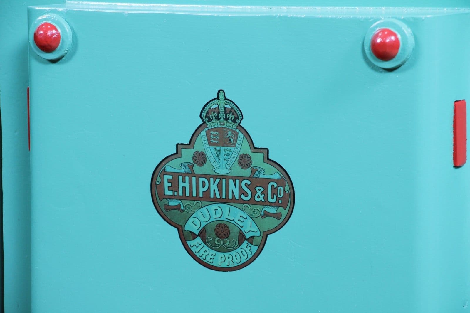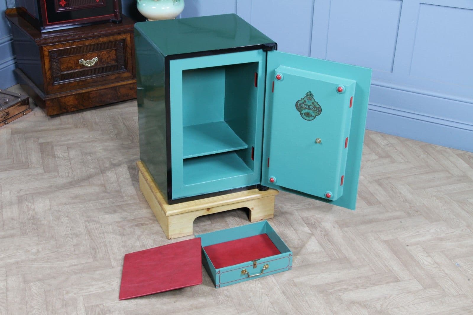 Opening the heavy door reveals a stunning contrast: the interior chamber is finished in a vibrant, period-correct muted turquoise, embellished with original red pinstripes and accents. It proudly features its original E. Hipkins & Co. internal transfer, confirming its fire resistance. The safe is complete with a useful, secure jewellery drawer which has its own working brass lever lock and keys (2) and is fitted with its original polished brass dropper handle. To match the red internal accents, our upholstery department has made high quality red full grain leather removable liners to keep your valuables and the safe itself protected from scratches or damage when items are stored inside. We have also included an automatic LED light inside the safe which comes on when the door is opened or detects movement. The light is easily removed, has a long life Li-ion battery, and is charged simply via USB.