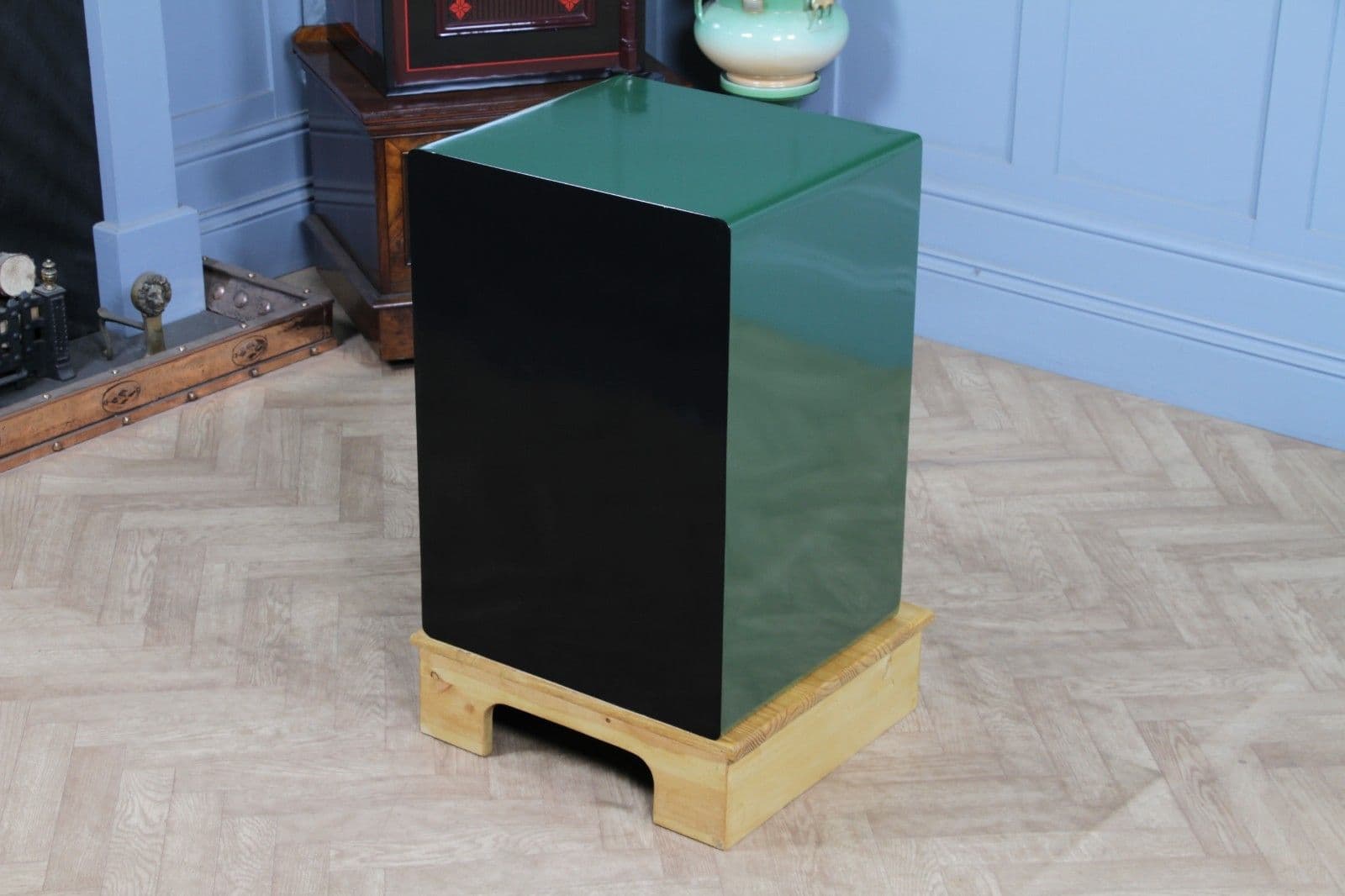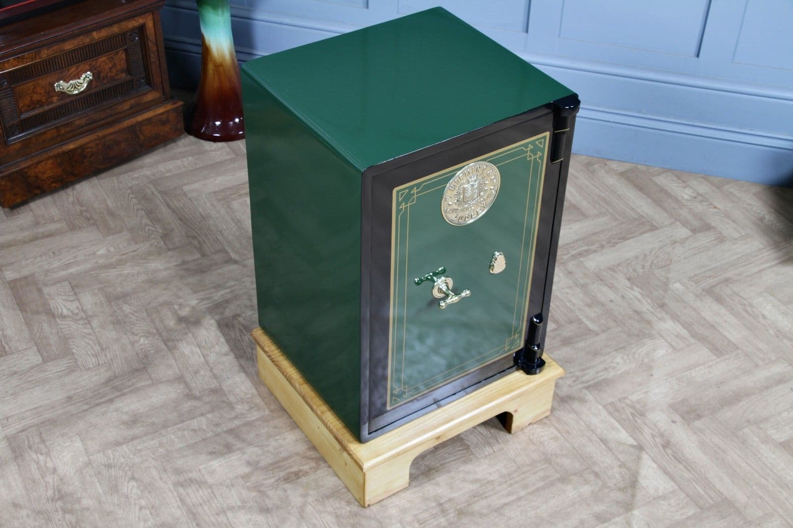 To enhance its functionality and appeal, we have also bespoke made a solid pine stand/plinth for the safe to sit on (finished in an antique pine stain). This plinth is specifically designed not only to protect your flooring, but also to raise the safe to a perfect lamp table height, preventing accidental knocks from foot traffic or damage from vacuum cleaners.