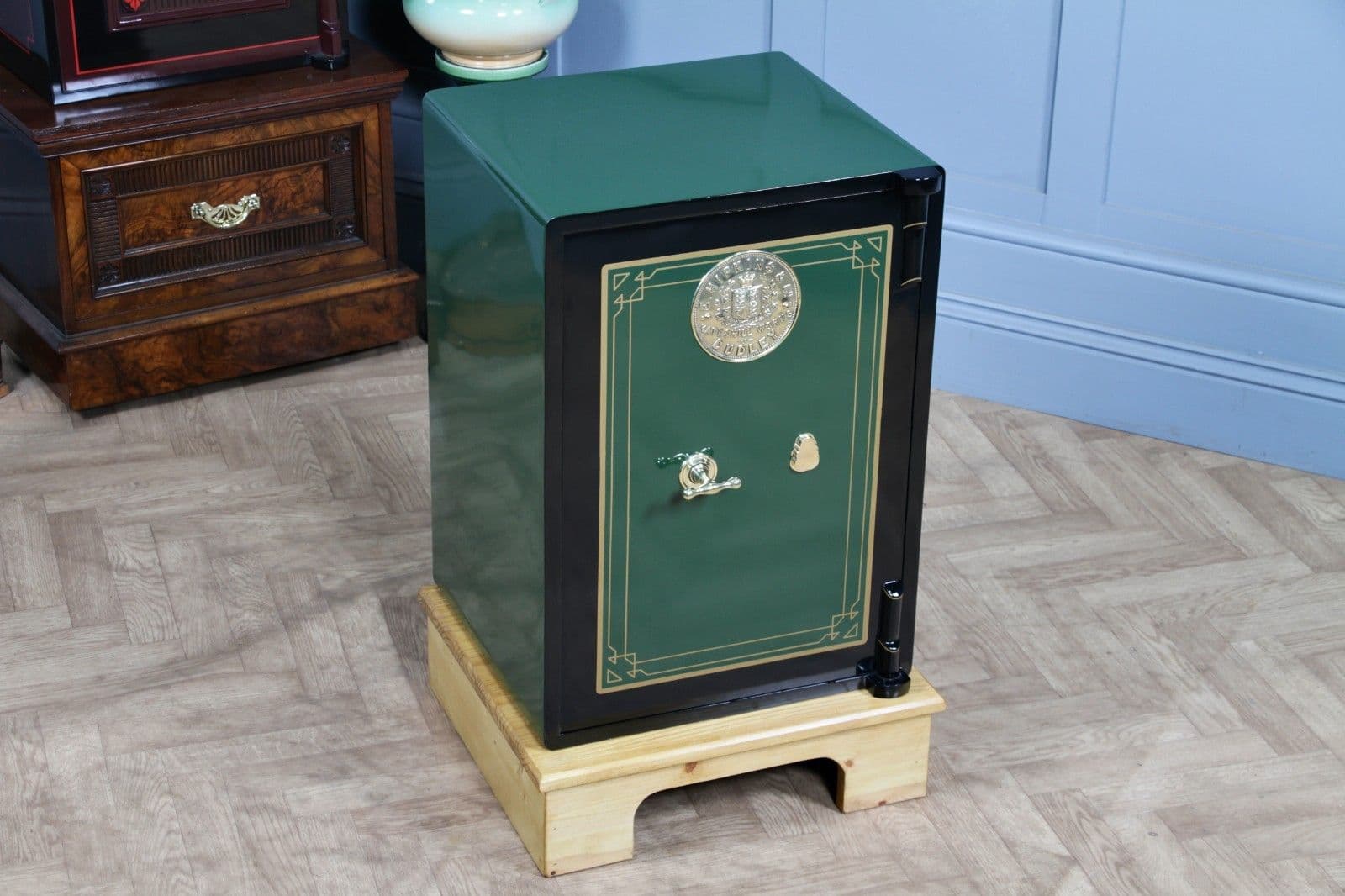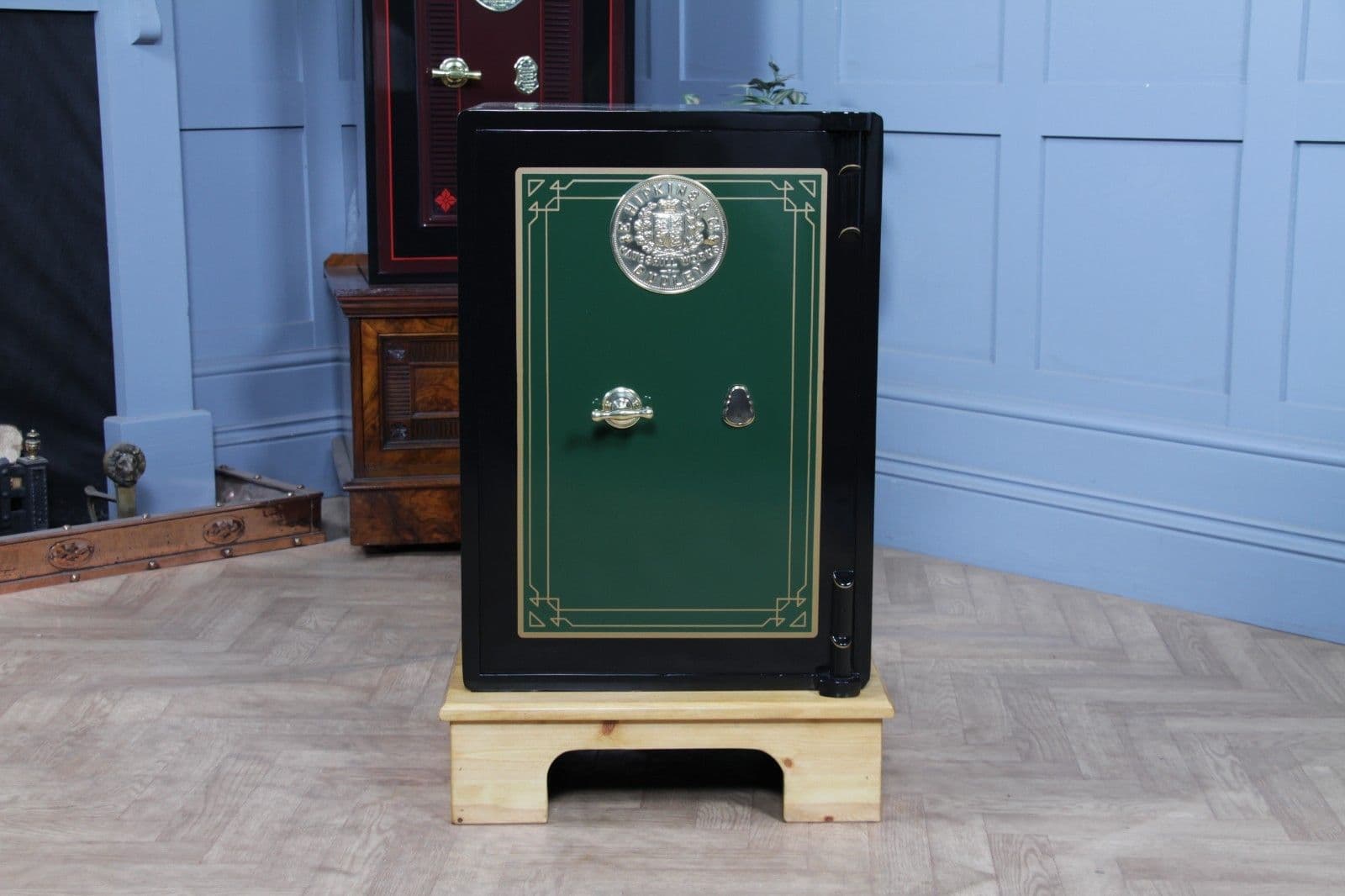 This E. Hipkins safe is the perfect secure addition to any discerning home, office, or retail space, offering an unparalleled blend of history, security, and exquisite, luxury finish, and will certainly be an interesting talking point for guests. It is ideal for storing important paperwork, house deeds, passports, cash, or jewellery, and is obviously very safe, powder, and theft-proof. The safe is also available without the stand should you not require the plinth.
