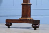 The top is supported by a truly distinctive and elegant three-sided (tri-faceted) pedestal. This unusual detail replaces the typical cylindrical shaft with three flat vertical faces that narrow as they descend to the base, lending the piece a refined visual lightness and serving as a key stylistic indicator of the high-end Regency period.