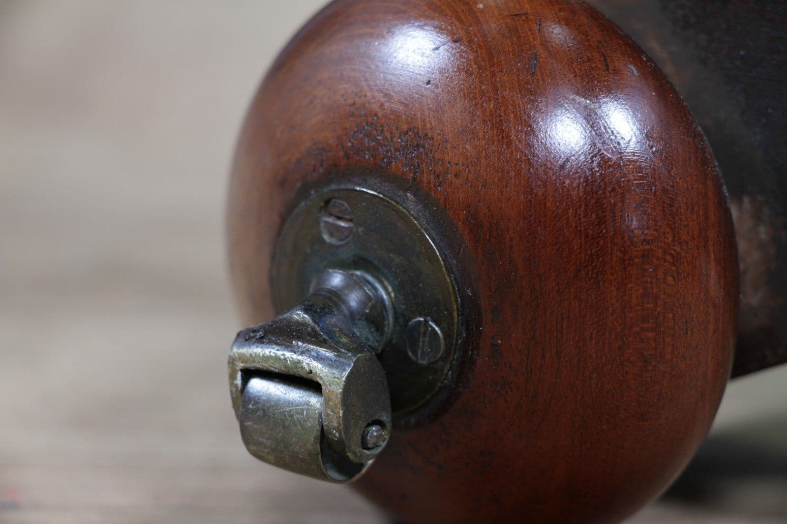 The pedestal terminates in a sturdy triform platform base—a classic three-legged support structure. The three substantial legs are boldly swept and scrolled, providing excellent balance and stability. Each leg culminates in a well-defined bun foot, fitted with its original, solid brass castor. These castors are notably charming, being low-proportioned and quite wide, an unusual feature that confirms the table's purpose as an easily movable piece for a formal room, while their solid brass construction attests to the high standard of original manufacture.
