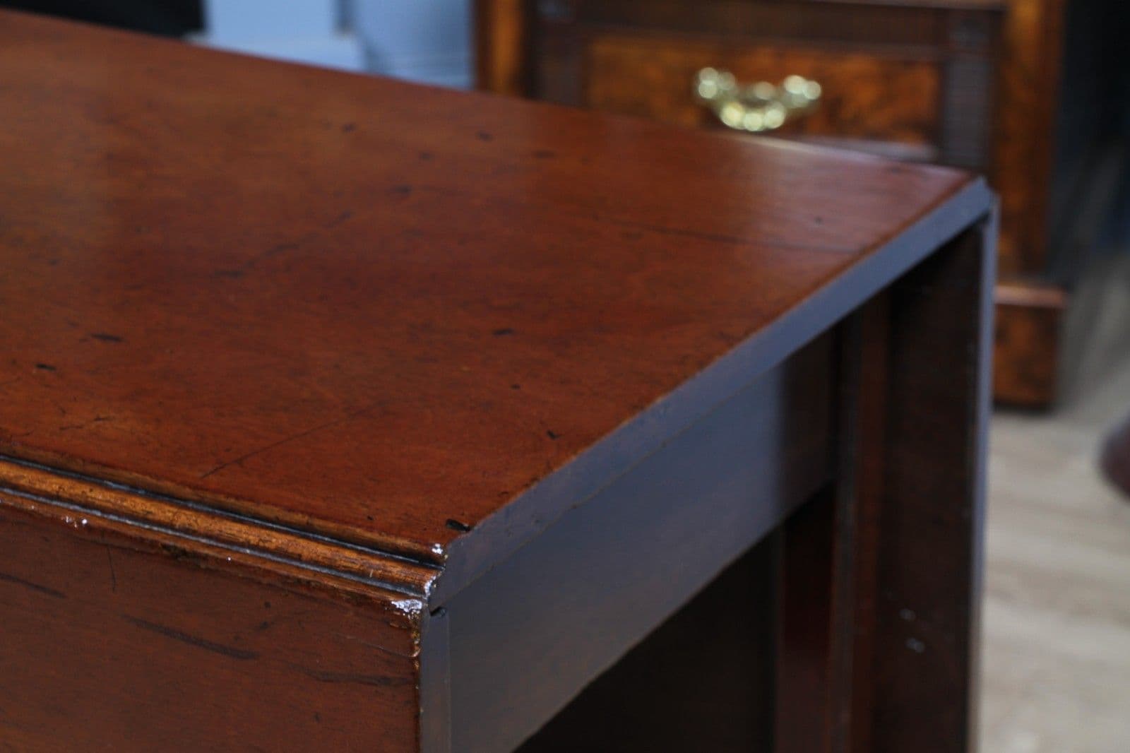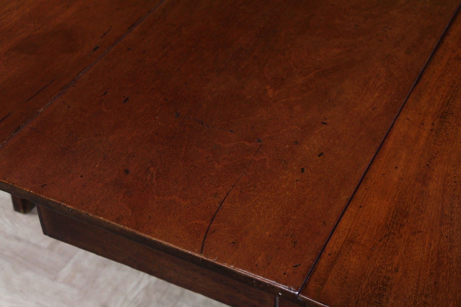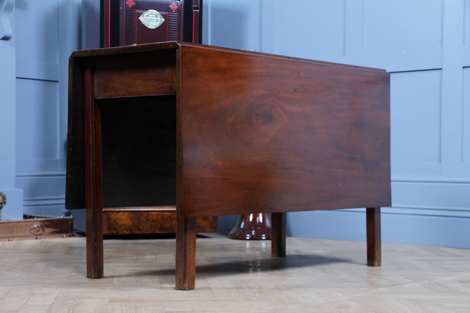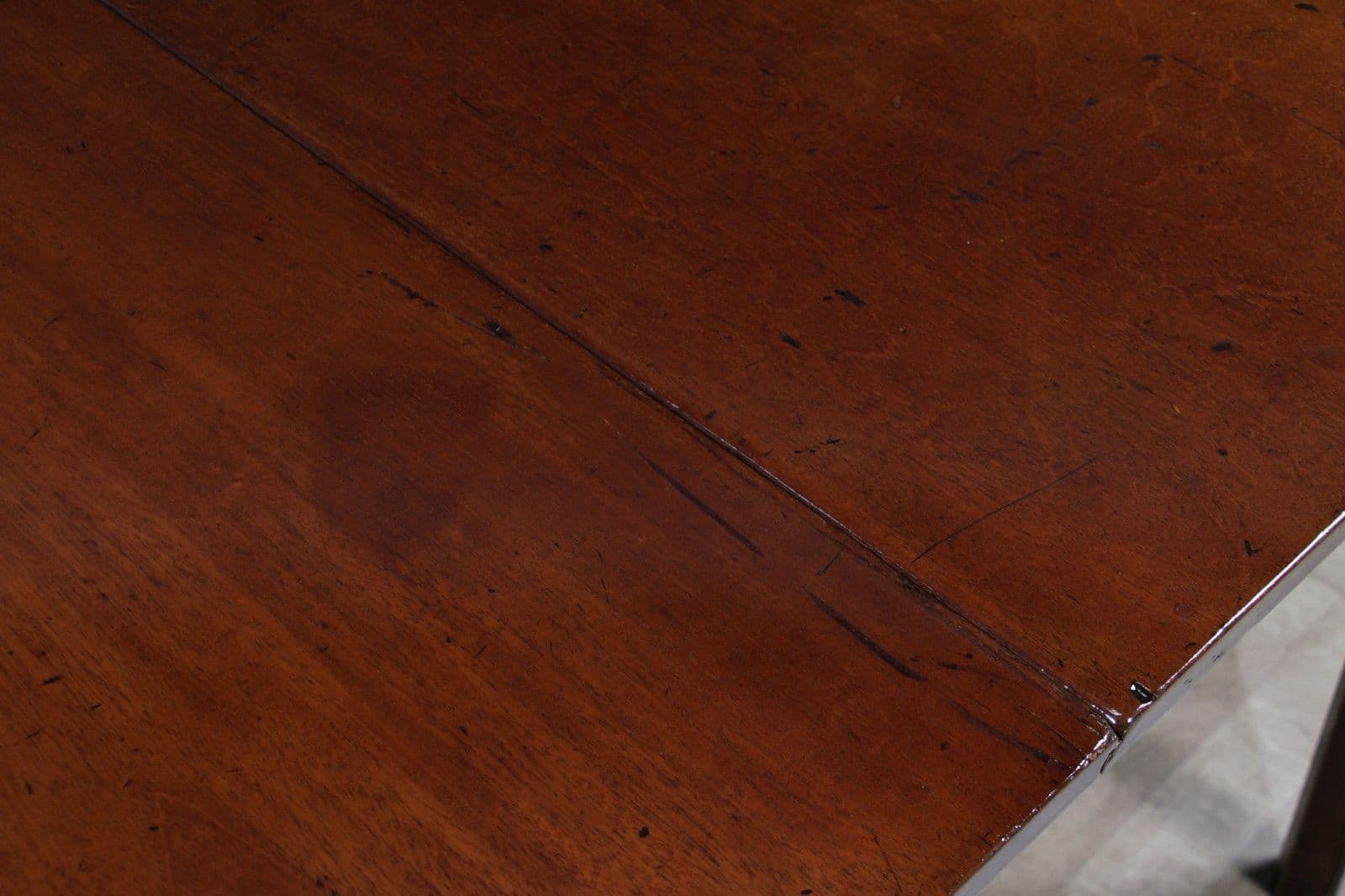 This table has a very small form yet is versatile from having a two large squared drop-down leafs managing to comfortably seat up to 6 people and be used as a dining, breakfast table or as a side table. This table features 4 straight, squared typical Georgian legs with a scratch moulding to the external edge. 2 of the legs are hinged on hand cut finger joints to support the leaves when opened, the table underside is jointed together nicely by dovetails which can be seen when these legs are out. The table is very well made and constructed well, its Mortise and Tenon joints are in great condition unusually without having any breaks or repairs meaning the table is rigid with no wobbles. The 1 plank solid Mahogany tops are notably flat without any splits and are not unduly twisted.