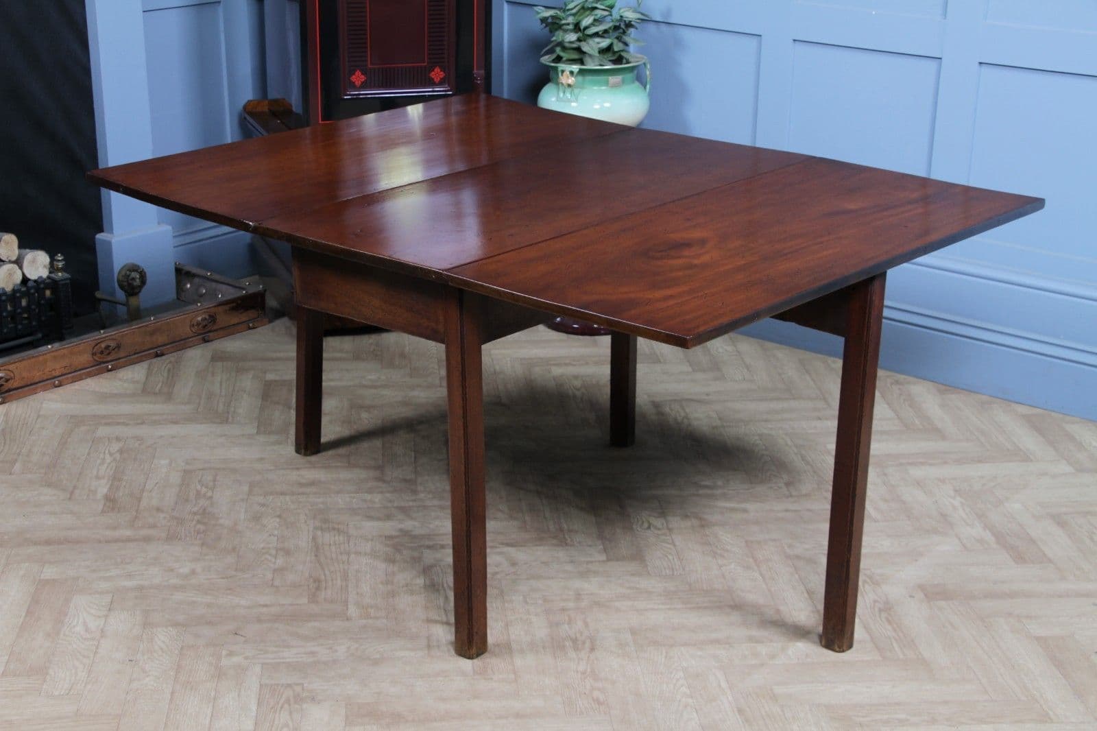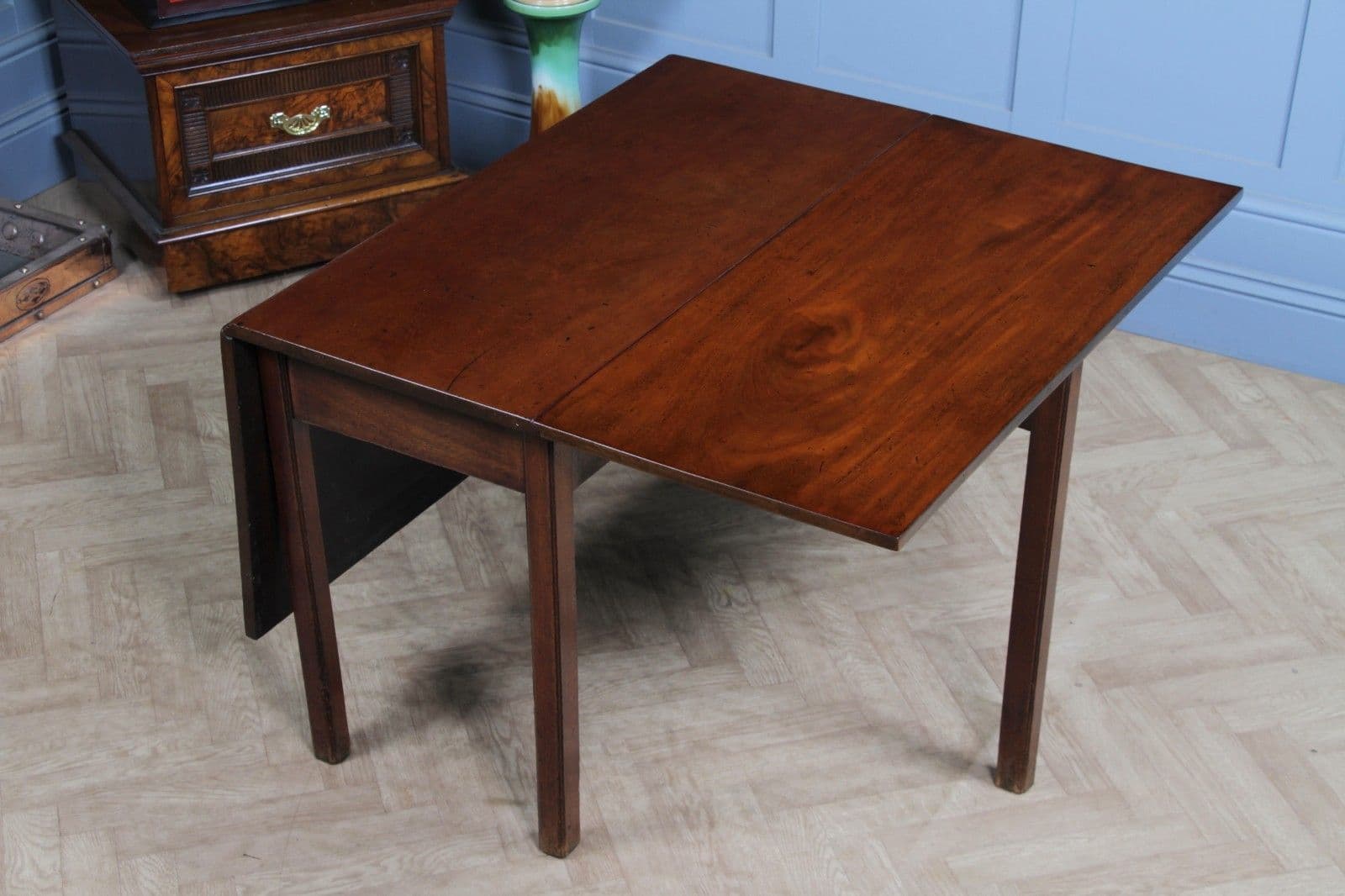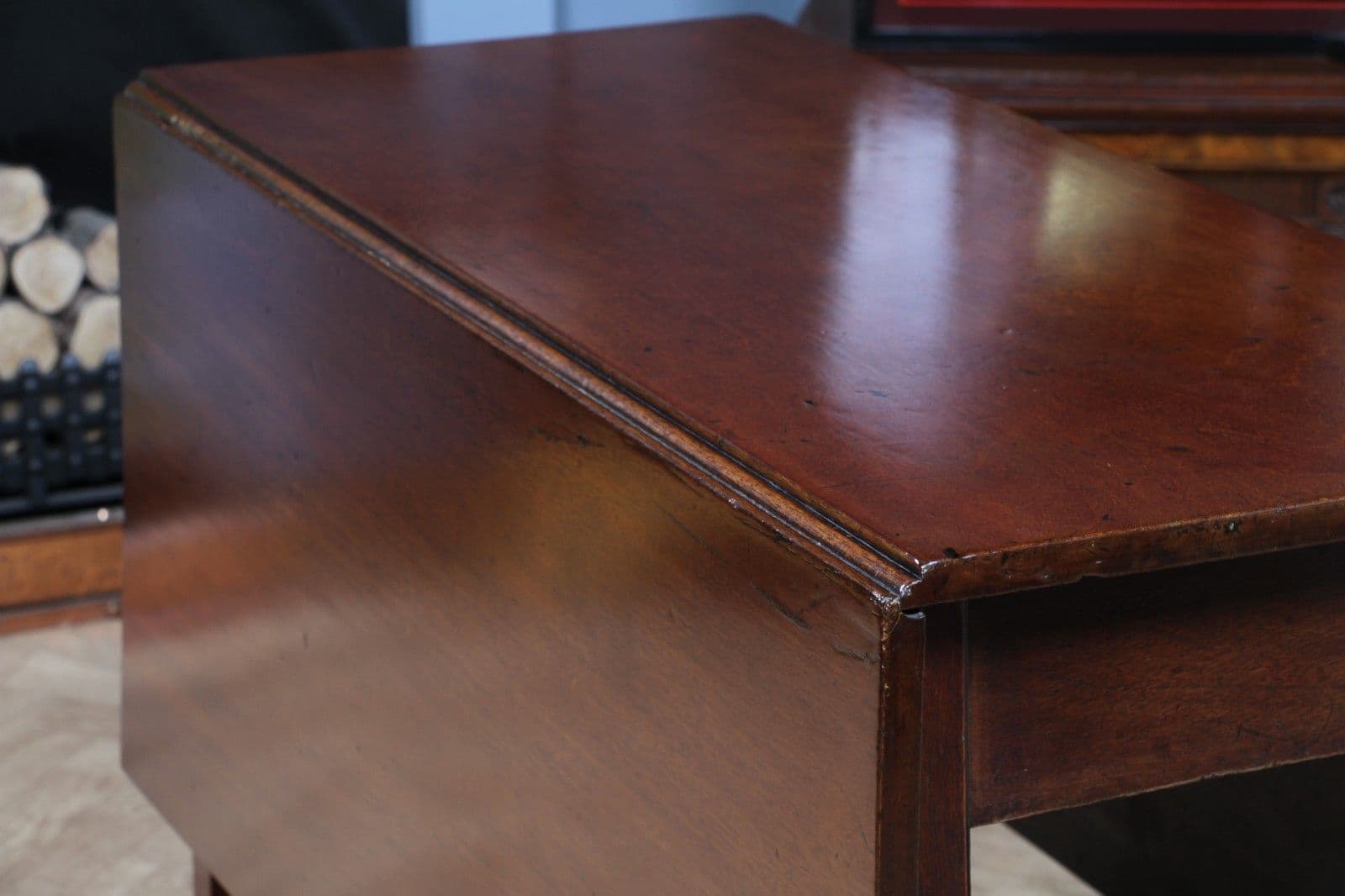 This table has a very small form yet is versatile from having a two large squared drop-down leafs managing to comfortably seat up to 6 people and be used as a dining, breakfast table or as a side table. This table features 4 straight, squared typical Georgian legs with a scratch moulding to the external edge. 2 of the legs are hinged on hand cut finger joints to support the leaves when opened, the table underside is jointed together nicely by dovetails which can be seen when these legs are out. The table is very well made and constructed well, its Mortise and Tenon joints are in great condition unusually without having any breaks or repairs meaning the table is rigid with no wobbles. The 1 plank solid Mahogany tops are notably flat without any splits and are not unduly twisted.