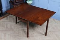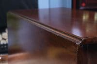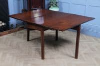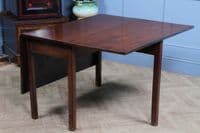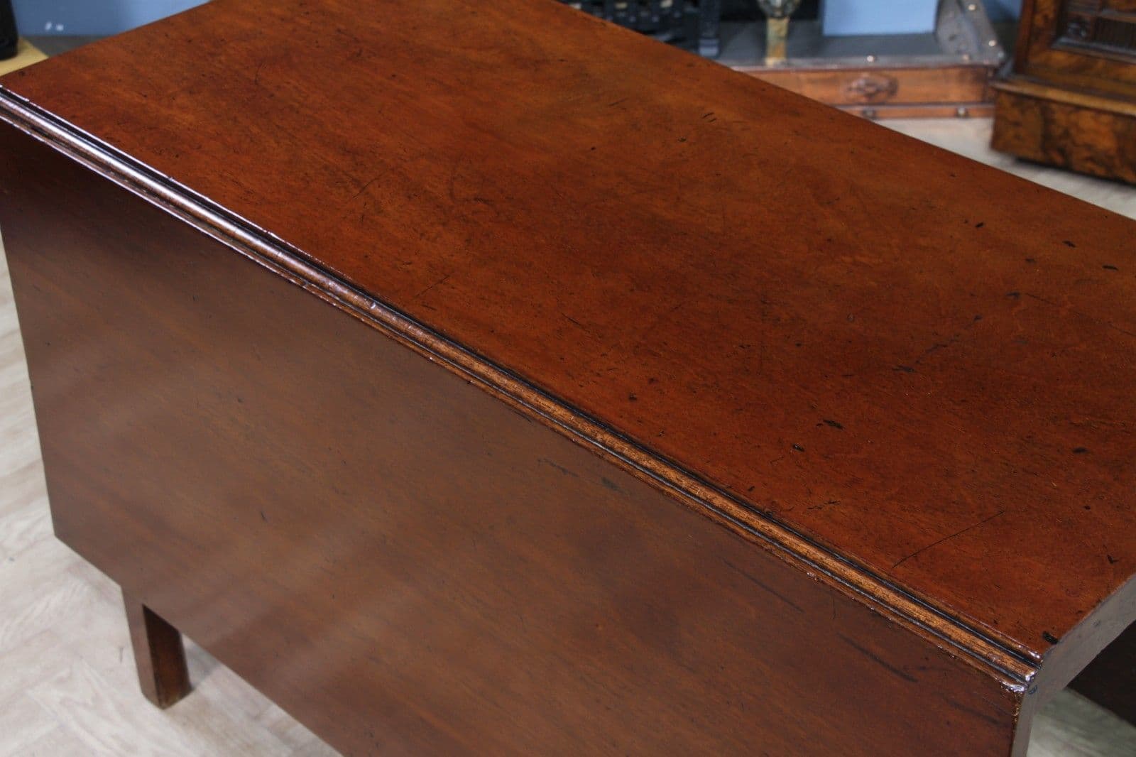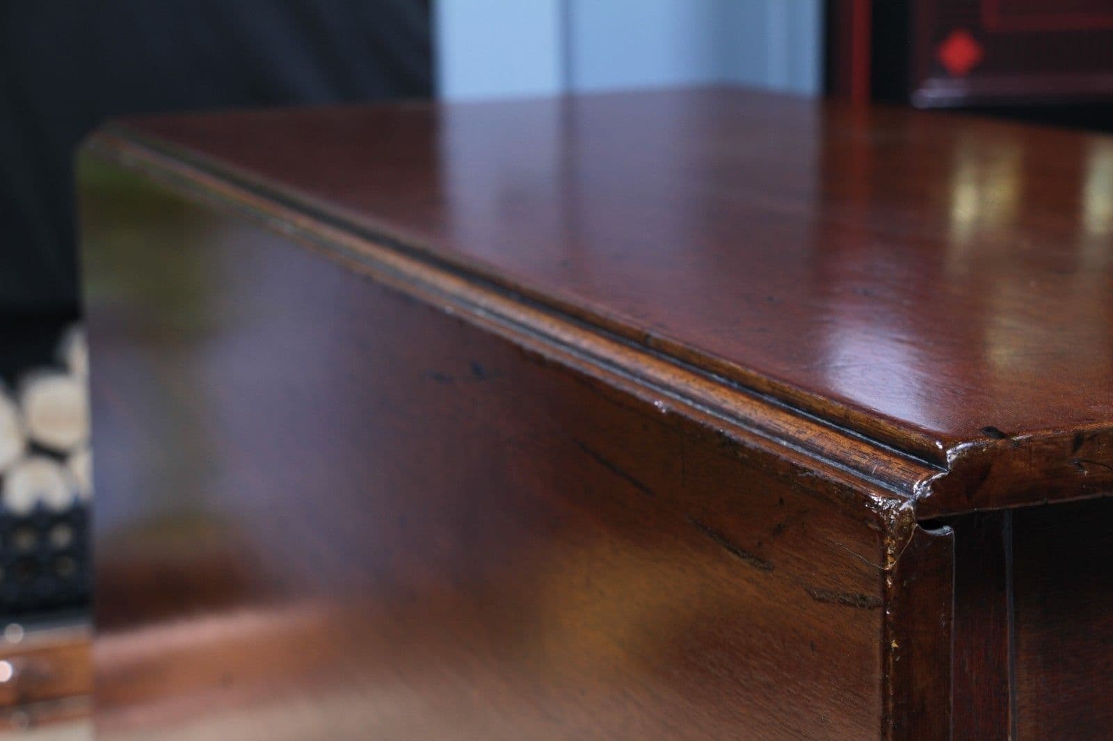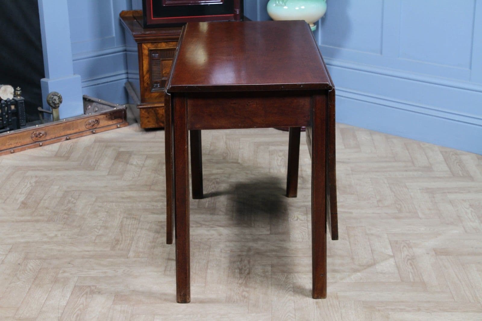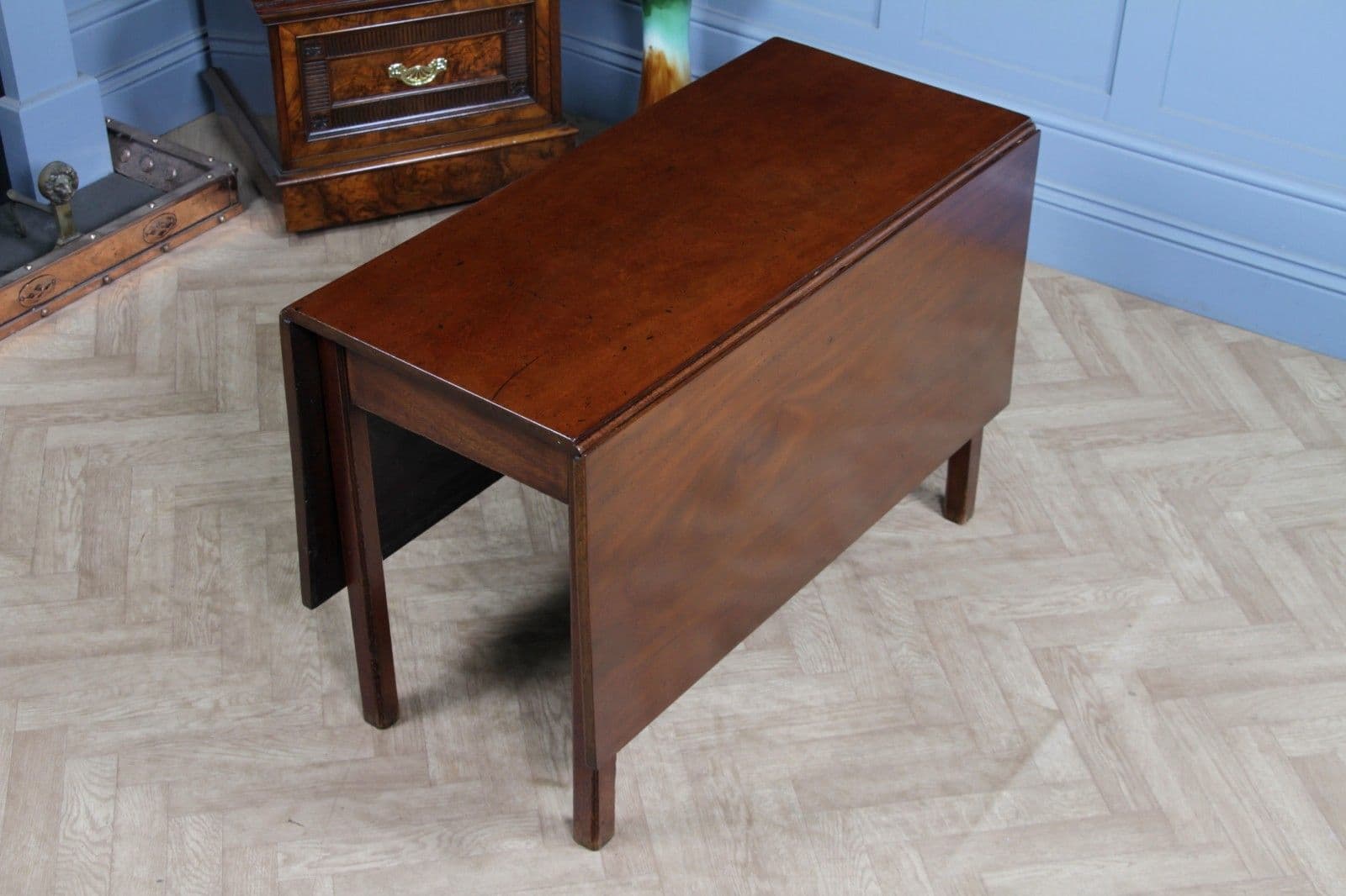 This table has a very small form yet is versatile from having a two large squared drop-down leafs managing to comfortably seat up to 6 people and be used as a dining, breakfast table or as a side table. This table features 4 straight, squared typical Georgian legs with a scratch moulding to the external edge. 2 of the legs are hinged on hand cut finger joints to support the leaves when opened, the table underside is jointed together nicely by dovetails which can be seen when these legs are out. The table is very well made and constructed well, its Mortise and Tenon joints are in great condition unusually without having any breaks or repairs meaning the table is rigid with no wobbles. The 1 plank solid Mahogany tops are notably flat without any splits and are not unduly twisted.