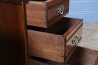 The tops of both cabinets have a lovely mounded edge finished with a lovely raised up-stand, a practical and stylish feature that prevents items from slipping off while adding to the overall refined aesthetic. This matching pair, in superb condition, would make a splendid and functional addition to any bedroom, offering both beauty and a rich sense of history.